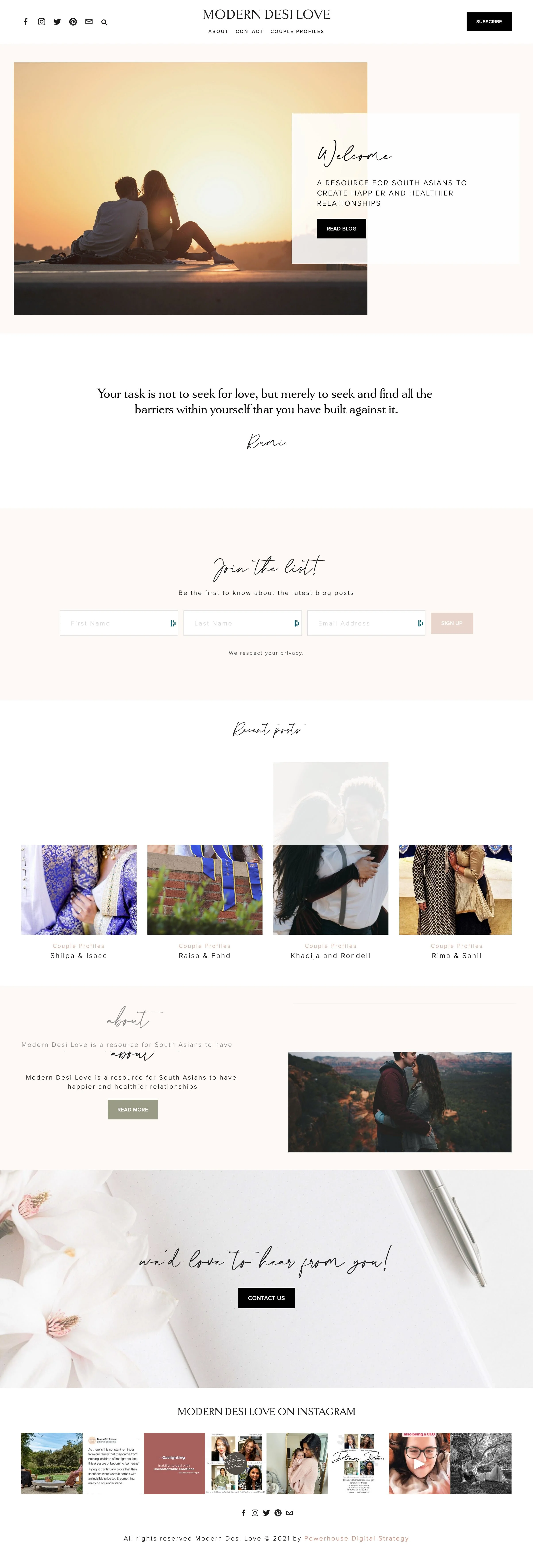 The result? Modern Desi Love, a digital reflection of Ann's personality and work. The site's fresh and feminine look is a perfect backdrop to Ann's relationship-focused blog, thanks to a light beige and peach color scheme. The contrast between the script and san serif fonts adds a touch of whimsy, harmonizing the romantic and practical aspects of her writing.